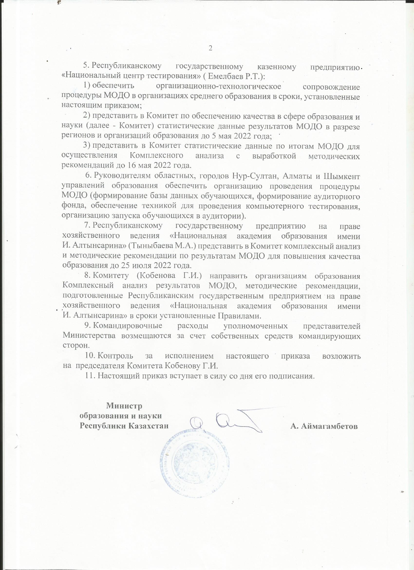 Приказ Министерства Образования и Науки Республики КазахстанО проведении мониторинга образовательных достижений обучающихся в организациях среднего образования в Республике Казахстан в 2022 году стр.2 |