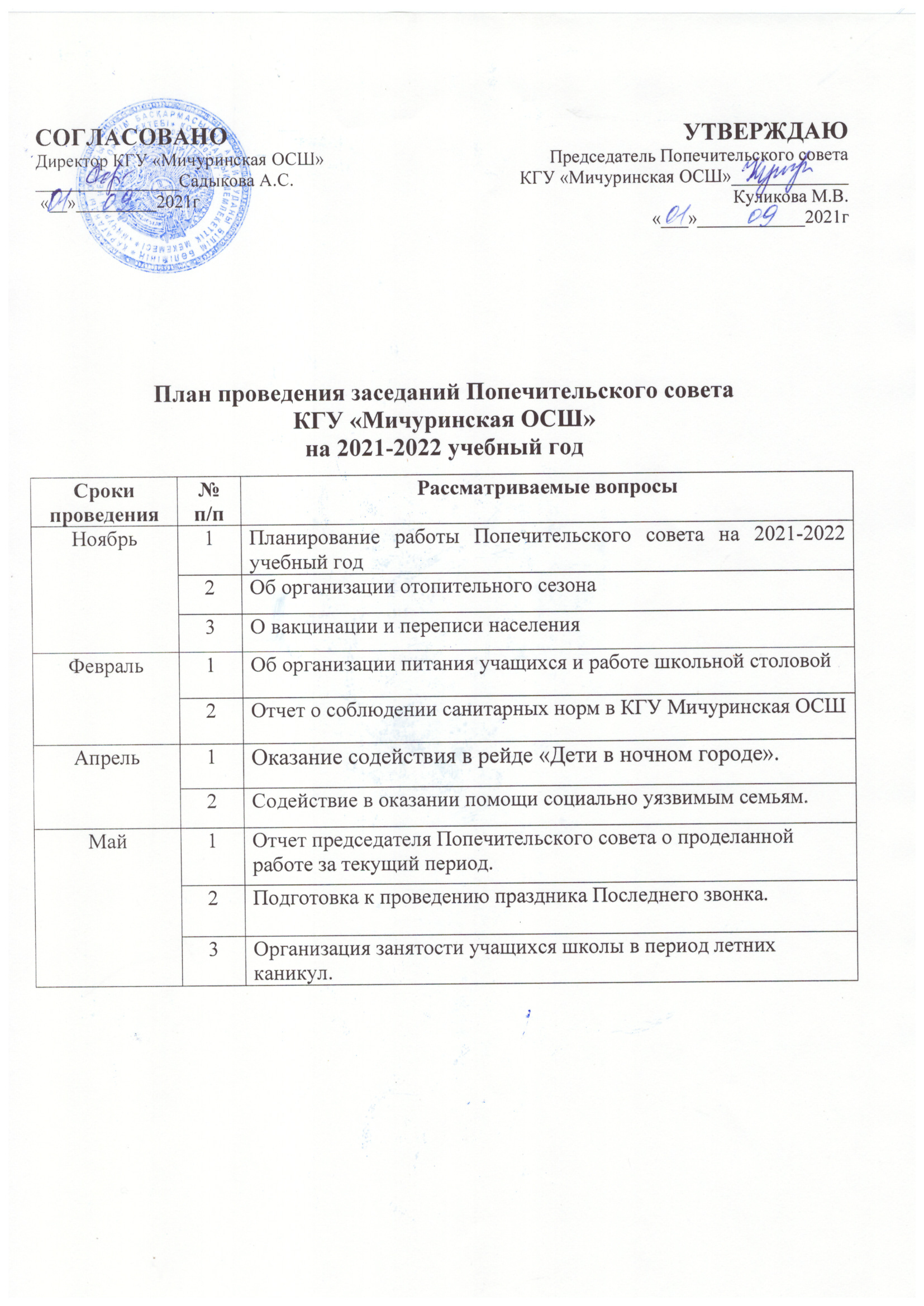 Қамқоршылық кеңестің 2021-2022 оқу жылына арналған отырыстарын өткізу жоспары"Мичурин орта мектебі" КММ Қамқоршылық кеңесінің 2021-2022 оқу жылына арналған отырыстарын өткізу жоспары. қараша-мамыр айларында қарастырылады |