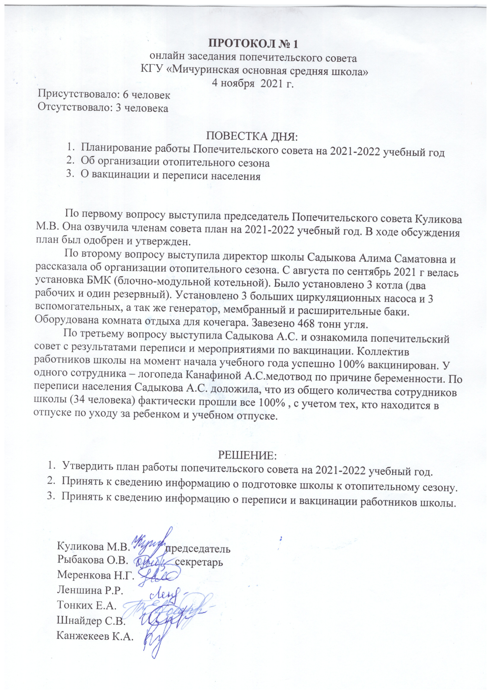 2021 жылғы 04 қарашадағы №1 хаттама2021 жылғы 04 қарашада "Мичурин ОМ КММ" Қамқоршылық кеңесінің онлайн отырысының №1 хаттамасы |