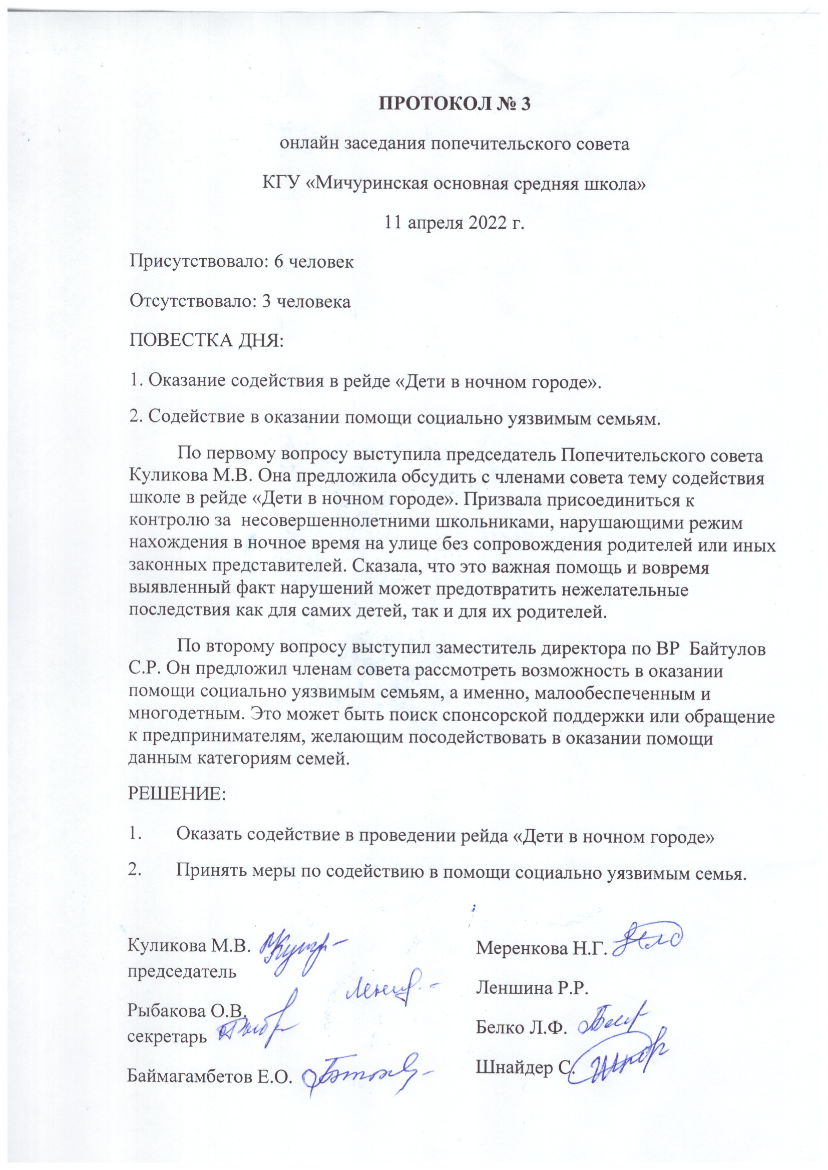 Протокол №3 от 11 апреля 2022 годаПротокол №3 онлайн заседания Попечительского Совета "КГУ Мичуринская ОСШ 11 апреля 2022 года |
