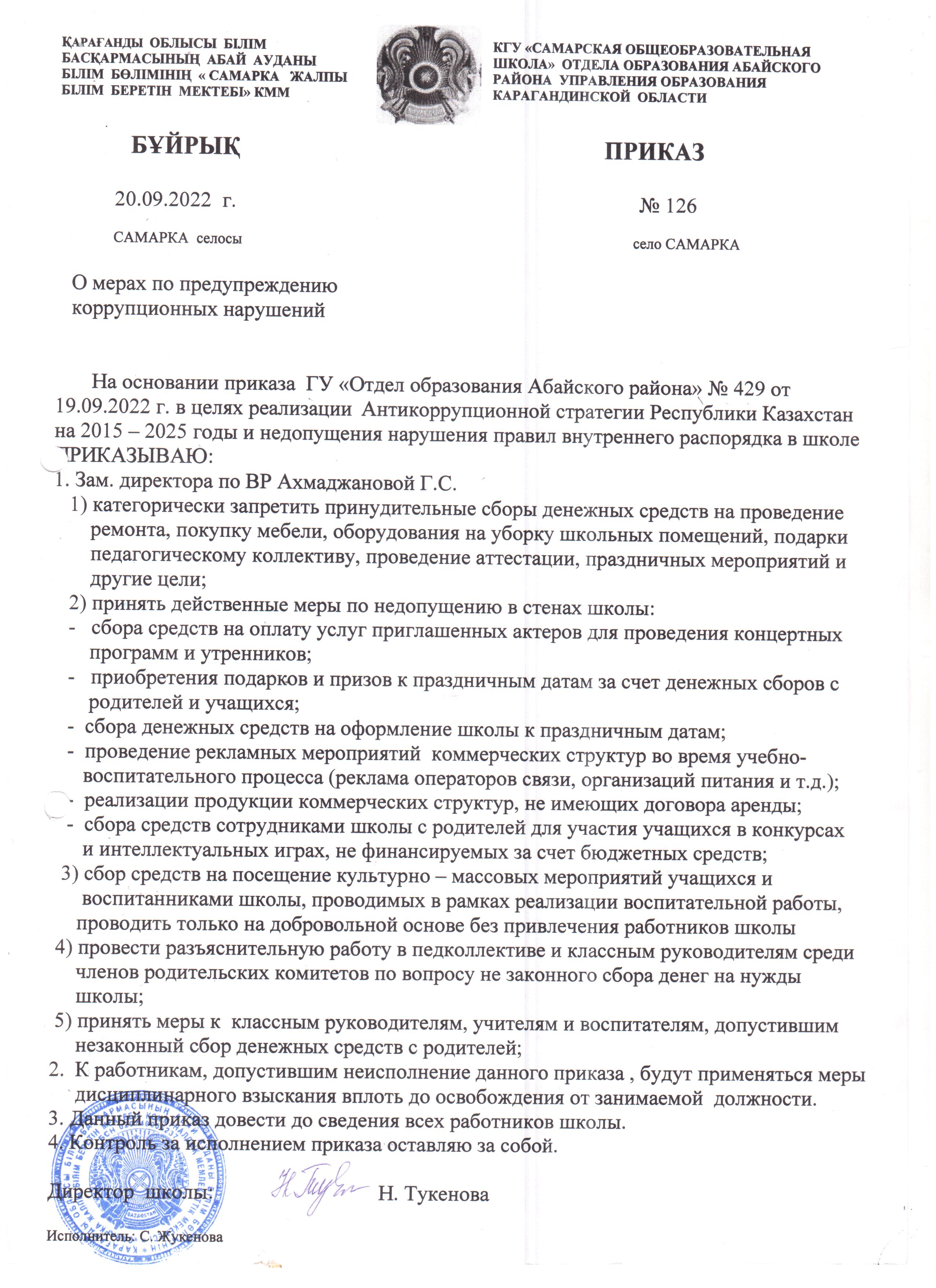 12.10.2022 О мерах по предупреждению коррупционных нарушений в КГУ "Самарская общеобразовательная школа"