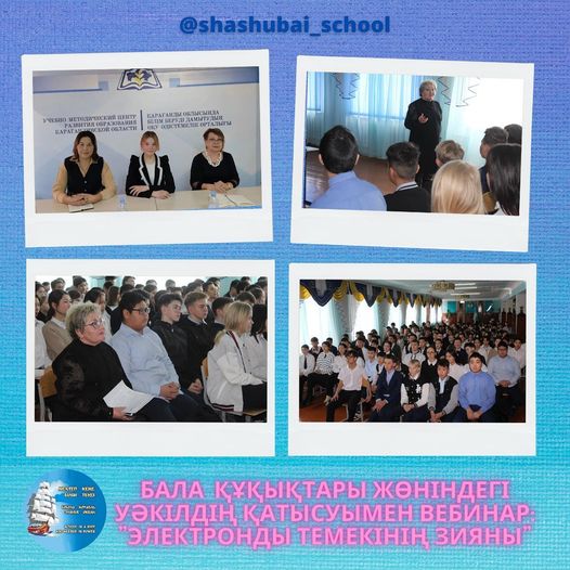 «Электронды темекінің зияны» ✍ 2023 жылы 3 ақпанда Бала құқықтары жөніндегі уәкілдің қатысуымен құқықтық сауаттылық апталығы аясында 8-10 сынып оқушылары үшін «Электронды темекінің зияны» тақырыбында вебинар өткізілді.