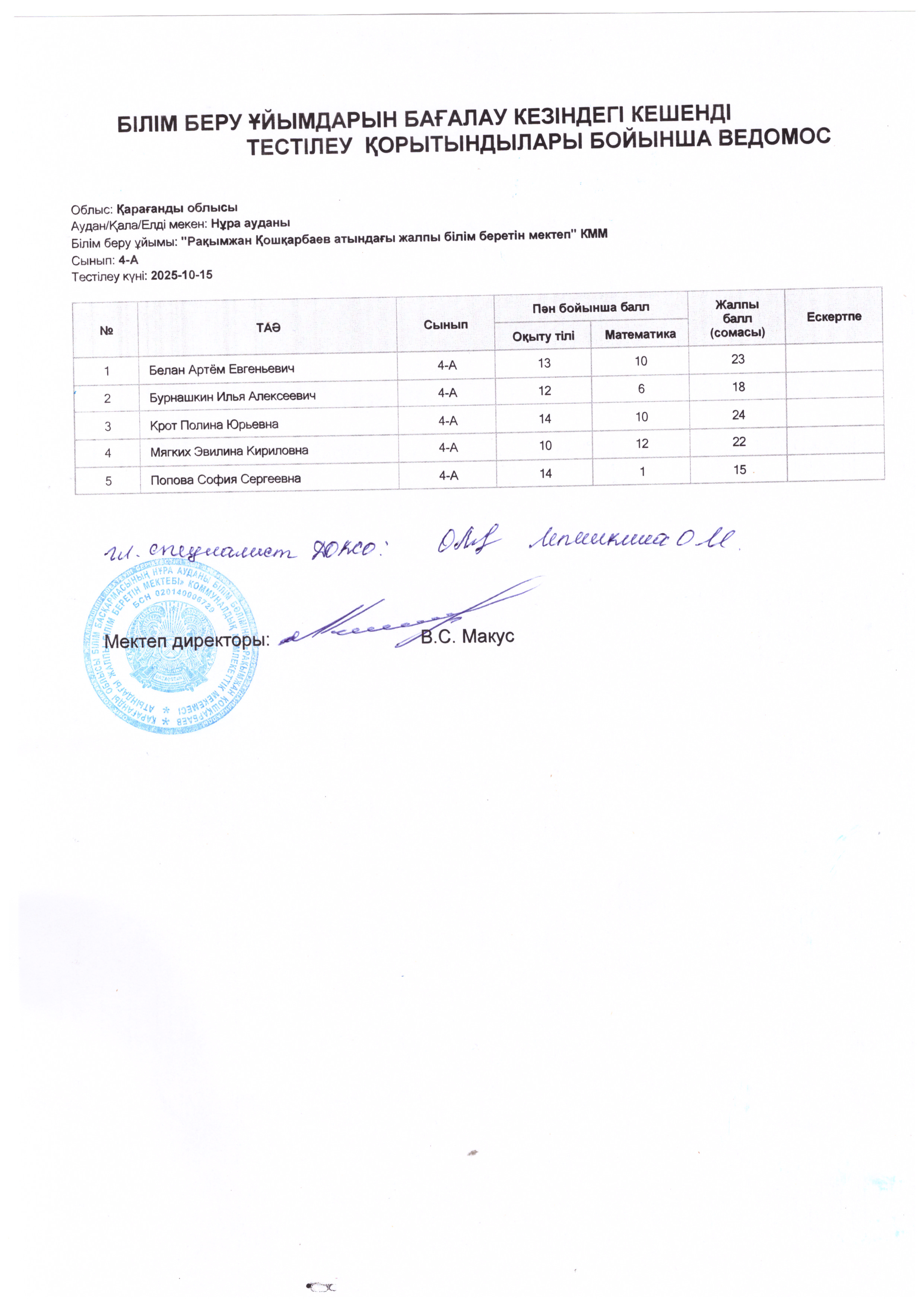 Ведомость по итогам комплексного тестирования при оценке организаций образованияВедомость по итогам комплексного тестирования при оценке организаций образования -4 класс |