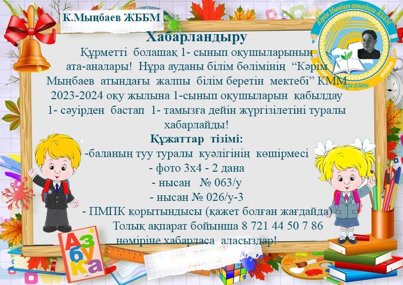 «Білім туралы» Қазақстан Республикасы Заңының 31-бабына, Қазақстан Республикасы Білім және ғылым министрлігінің 2018 жылғы 12 қазандағы №564 (ҚР Білім және ғылым министрінің 24.06.2020 №264 бұйрығымен өзгерістер мен толықтырулар енгізілген) бұйрығына сәйкес 2023-2024 оқу жылында 1-сыныпқа құжаттарды қабылдау ағымдағы жылдың 01 сәуірінен басталып 01 тамызға дейін жалғасады.