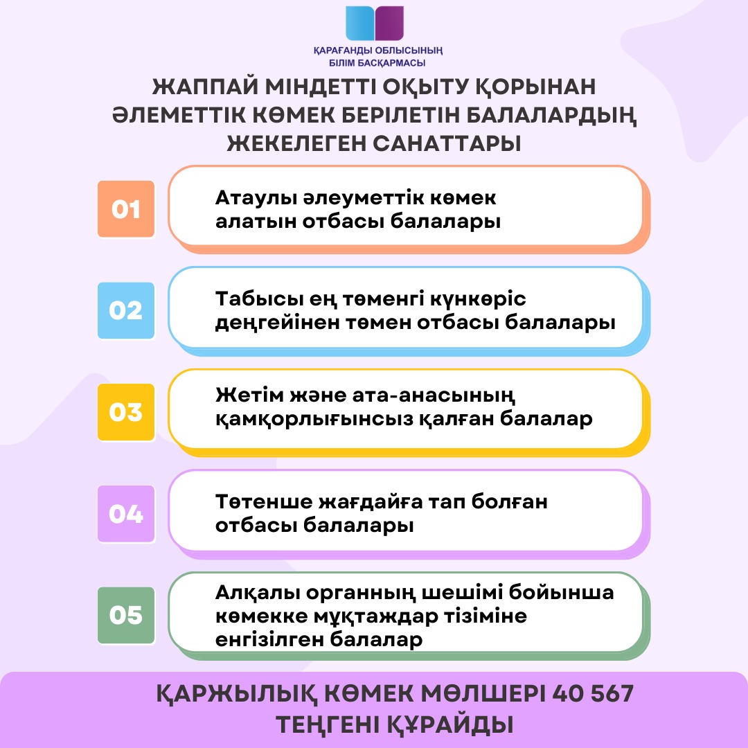 Жаппай міндетті оқыту қорынан әлеуметтік көмекЖаппай міндетті оқыту қорынан әлеуметтік көмек берілетін балалардың жекелеген санаттары |