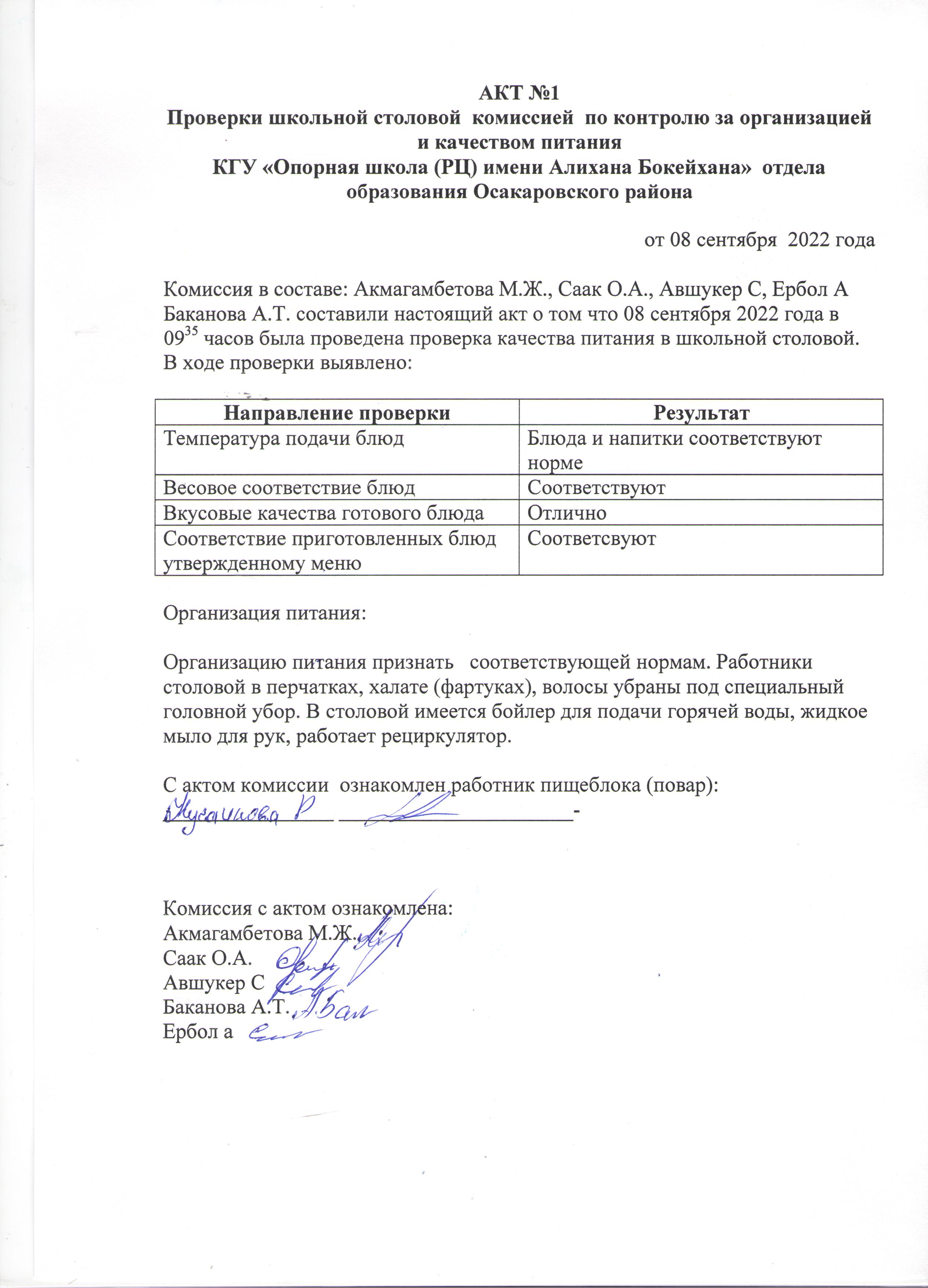 Акт№1Проверки школьной столовой комиссией по контролю за организацией и качеством питания |