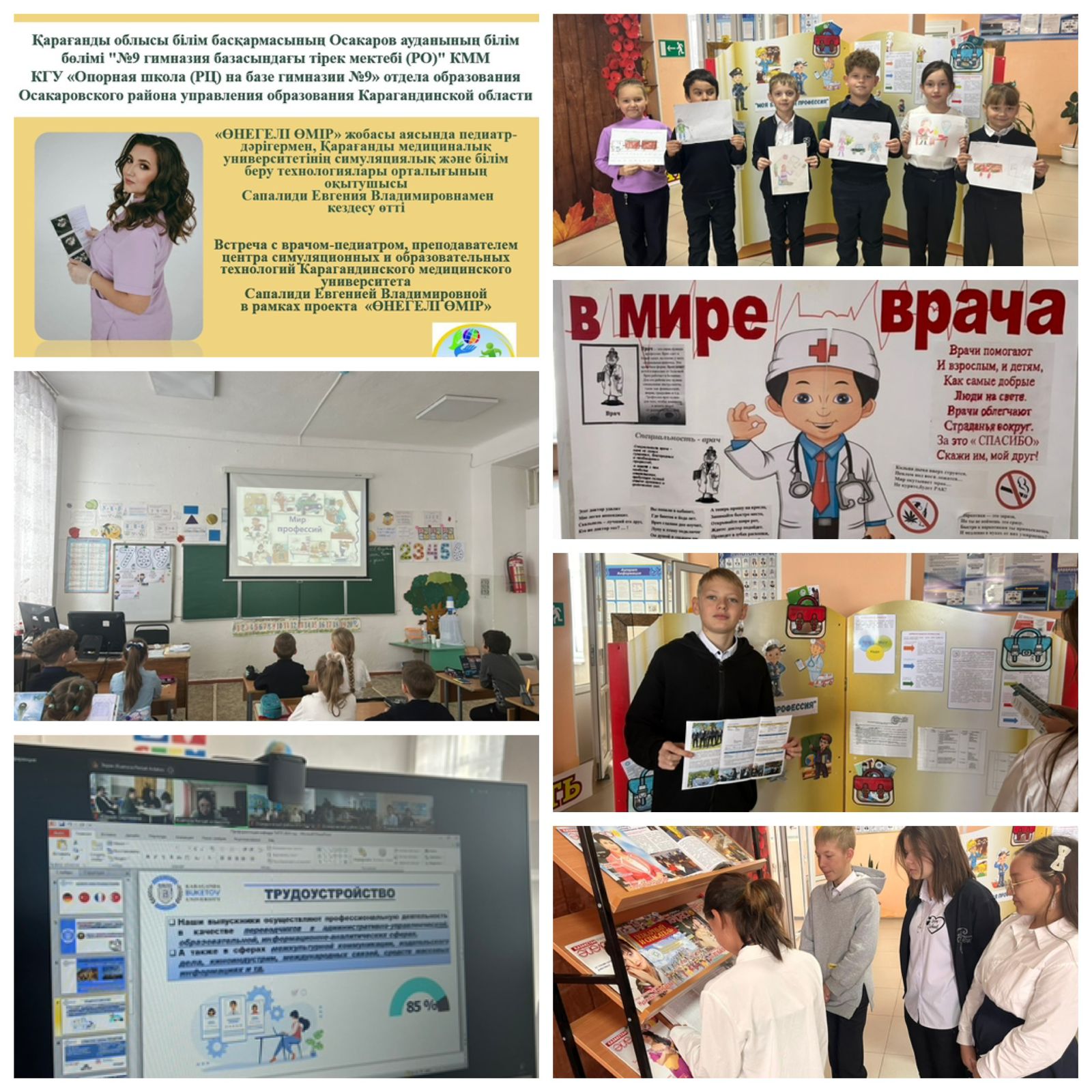 Менің болашақ мамандығым2024 жылғы 13 қарашада "№9 гимназия базасындағы Тірек мектебі (РО)" КММ-де "Менің болашақ мамандығым" кәсіптік бағдар беру апталығы аясында жоғары сынып оқушылары арасында, сондай-ақ медициналық сыныптың қатысуымен Қарағанды медициналық университетінің педиатр-дәрігері, симуляциялық және білім беру технологиялары орталығының оқытушысы Сапалиди Евгения Владимировнамен "Өнегелі өмір" жобасы аясында кездесу өтті. Кездесуде Евгения Владимировна оқушыларға Қарағанды медициналық университетінің оқу блоктарын көрсетті, дәрігер мамандығы, ЖОО-ға түсу туралы әңгімеледі, сондай-ақ студенттер Евгения Владимировна гимназия оқушыларына шағын сұхбат берді. Кездесу танымды және қызықты өтті. |