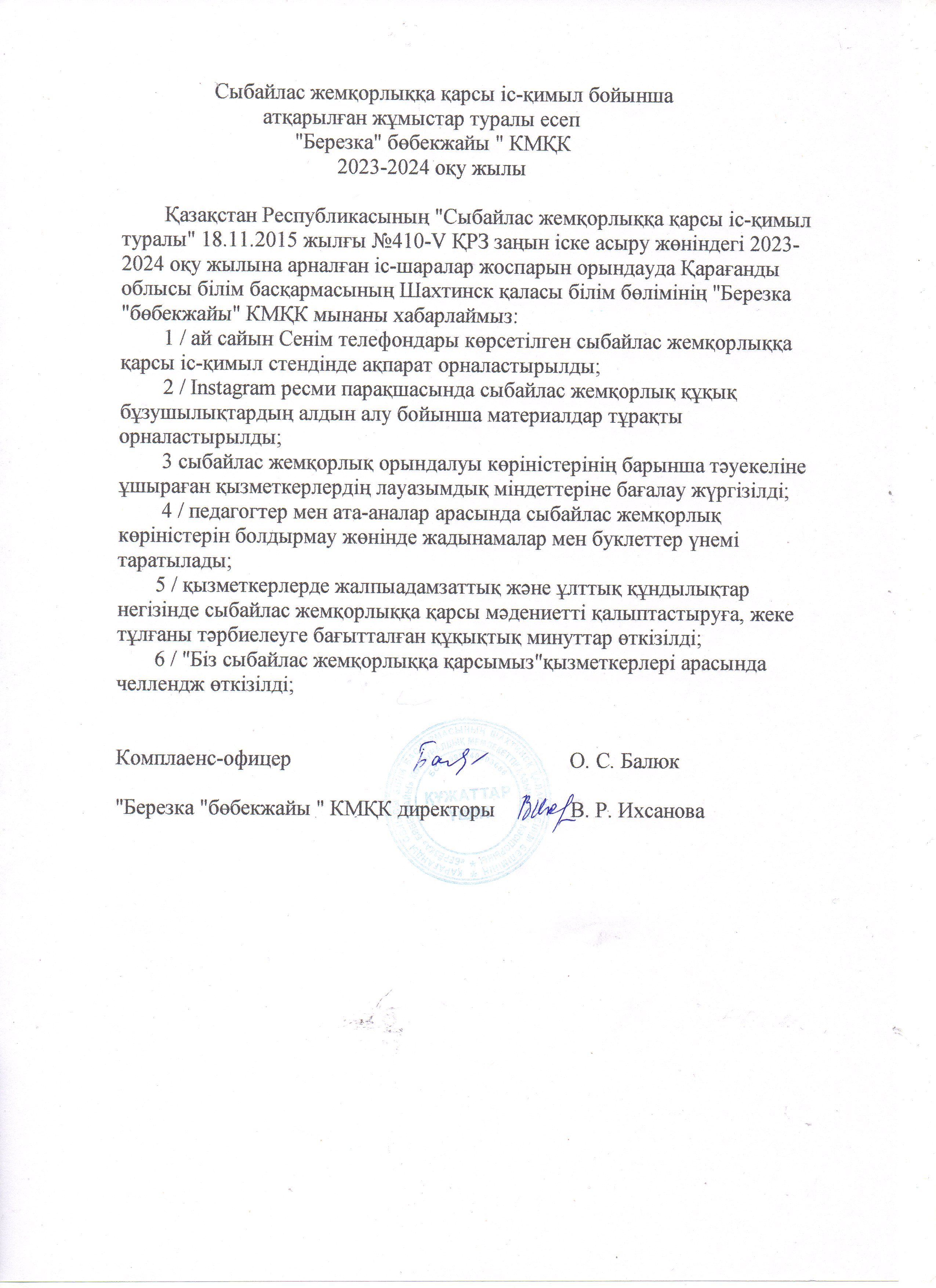 Отчет о проделанной работе по противодействию коррупции КГКП «Ясли-сад «Березка» 2023-2024 учебный годисполнение отчет мероприятии |