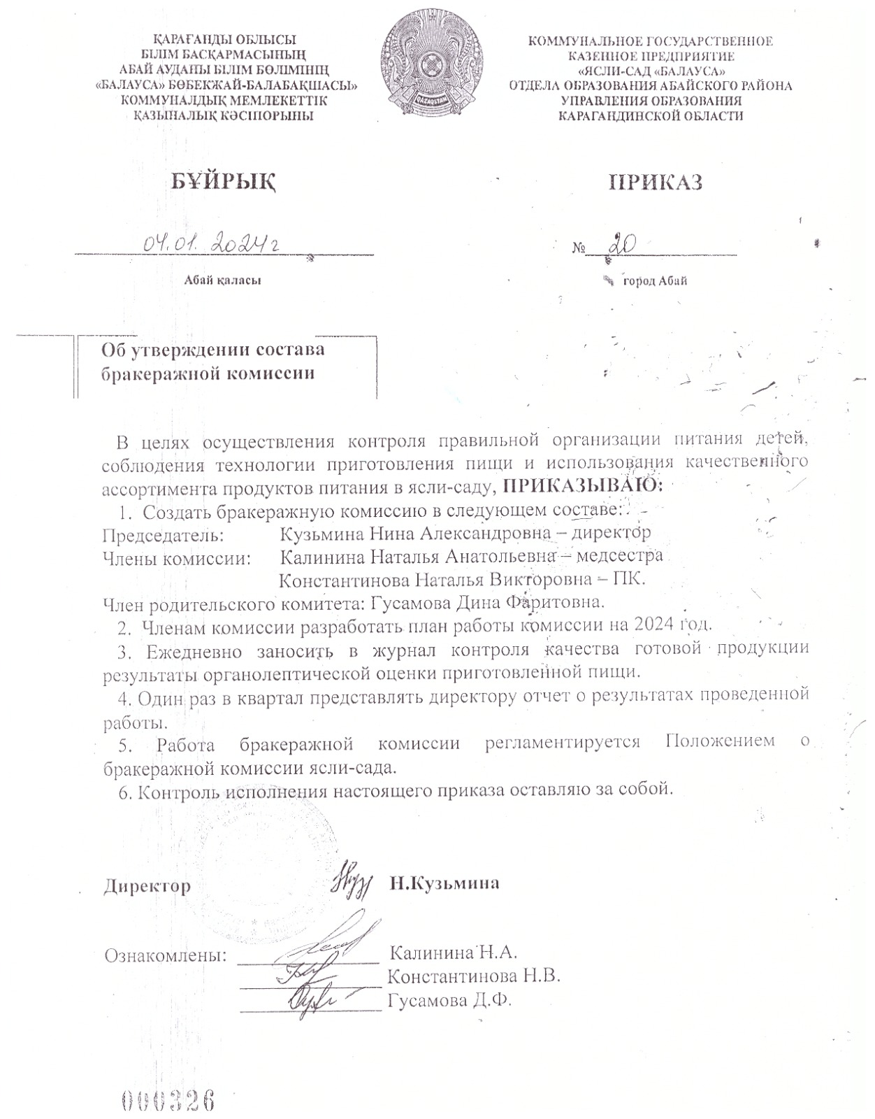 ПриказПриказ об утверждении состава бракеражной комиссии |