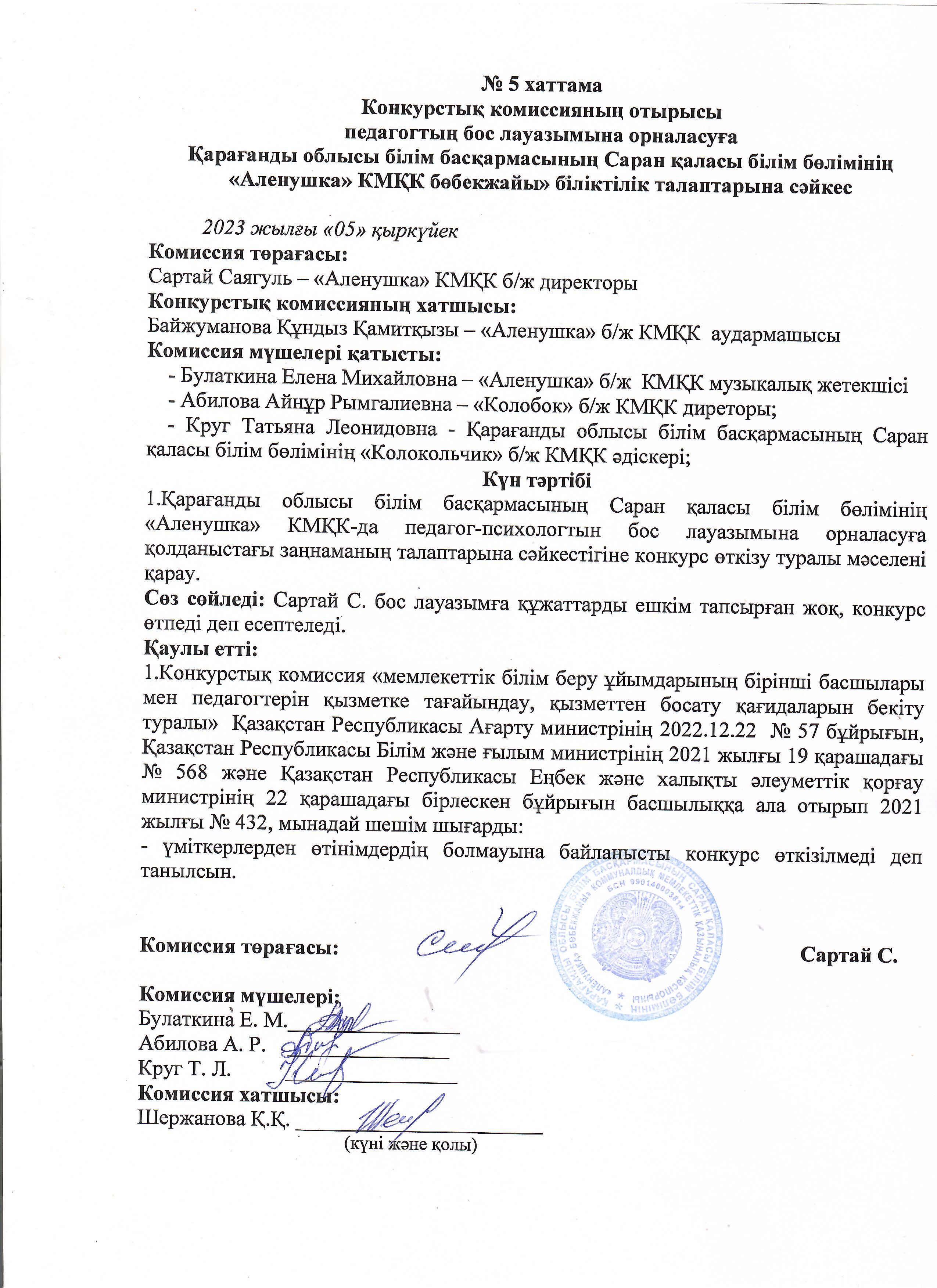 Заявления для участия принимаются в течение 7 рабочих дней после опубликования объявления по адресу: 100024, Карагандинская область, город Сарань, поселок Актас, улица Ленинградская, строение 14, телефоны: раб-5-50-45 электронная почта alenushka.de@mail.ru