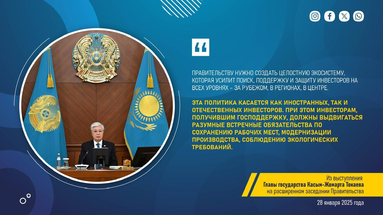 Мемлекет басшысы жиын барысында Үкімет жұмысының басты бағыттарын айқындады. Атап айтқанда, Қасым-Жомарт Тоқаев экономиканы әртараптандыру, инфрақұрылымды дамыту ісін жаңа деңгейге көтеру, цифрлық технологияны жан-жақты енгізу, энергетиканы дамыту және ядролық кластер құру, агроөнеркәсіп кешенінің әлеуетін арттыру, салық-бюджет саясатын реформалау, маңызды жобаларды қаржы көздерімен қамтамасыз ету, сондай-ақ әлеуметтік қолдау ісін реттеп, денсаулық сақтау, білім беру және ғылым саласын одан әрі дамыту жөніндегі нақты міндеттер мен жоспарларға тоқталды.