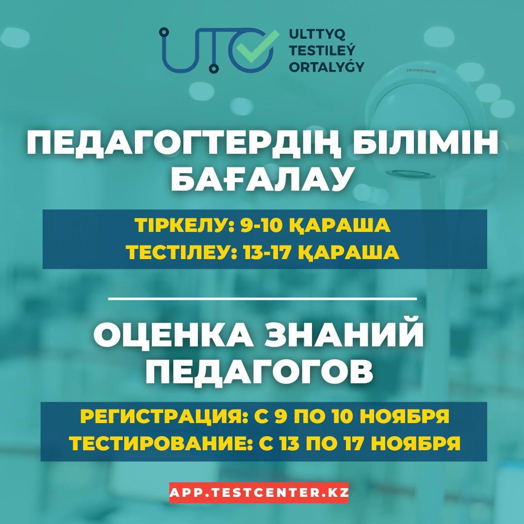 2023 жылғы 9-10 қараша аралығында app.testcenter.kz сайтында ПЕДАГОГТЕРДІҢ БІЛІМІН БАҒАЛАУҒА өтініштерді қабылдау жүргізіледі.