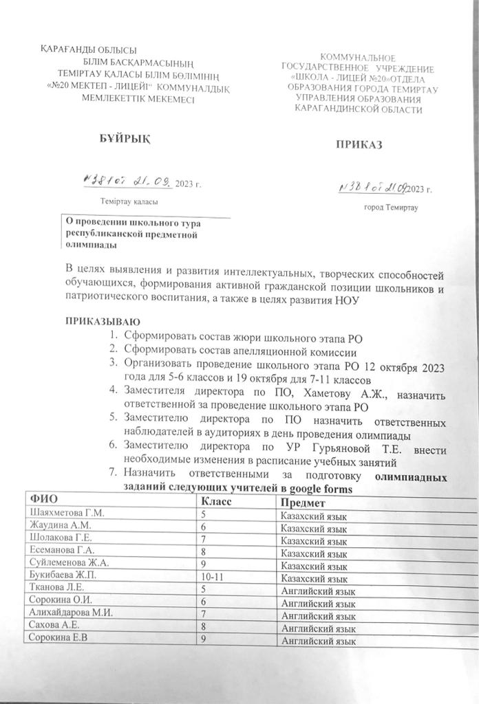 24 августа 2023 года в КГУ "Школа -лицей№20" проведено заседание комиссии о занятии вакантных должностей: