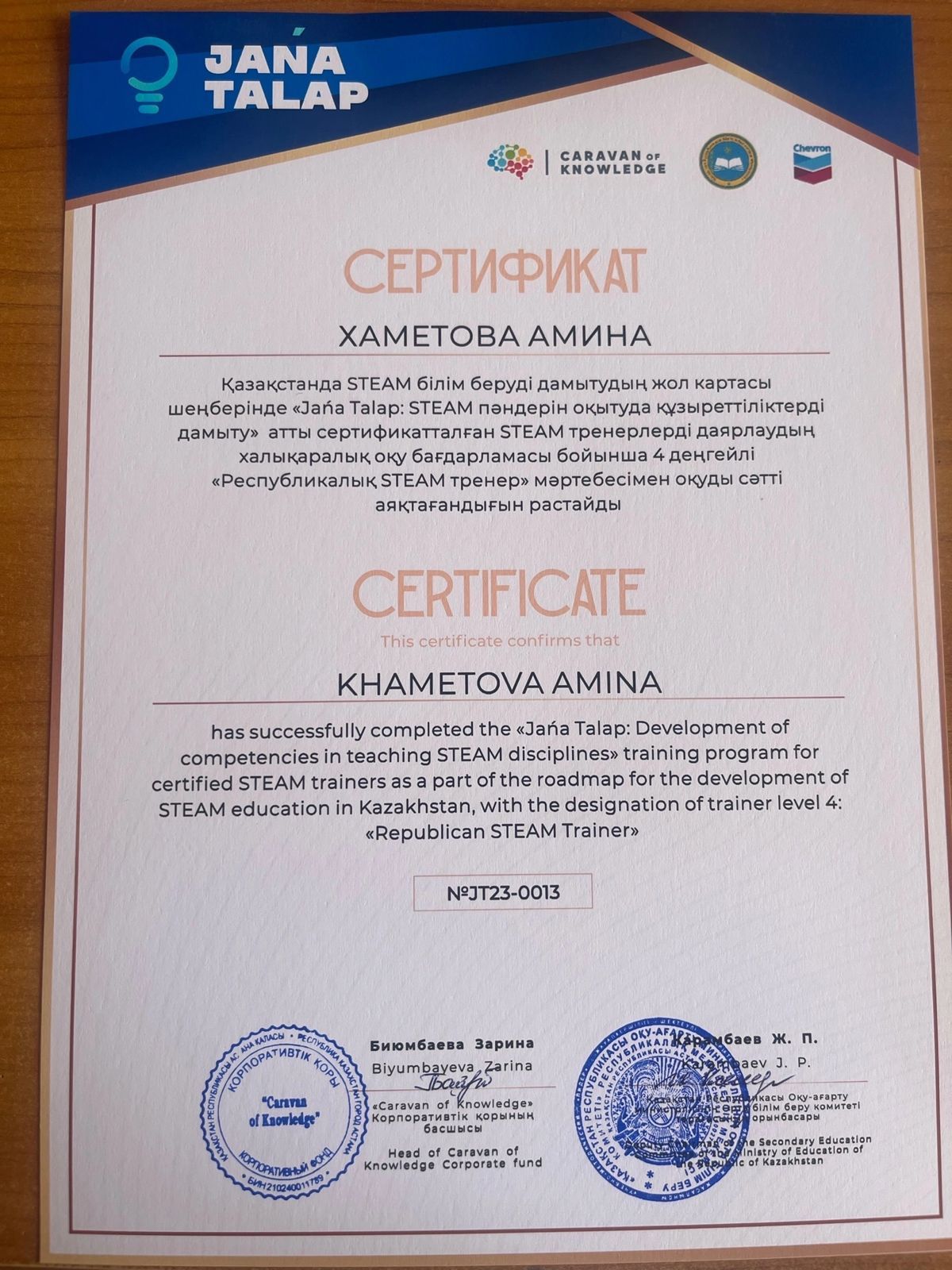 2020 - ҚР ЮНЕСКО клубтар академиясының Құрмет грамотасы. 2021-Теміртау қ. Білім бөлімінің Алғыс хаты. 2022-"Өрлеу "Біліктілікті Арттыру Ұлттық орталығы" АҚ-ның Алғыс хаты (Алматы қ.)…