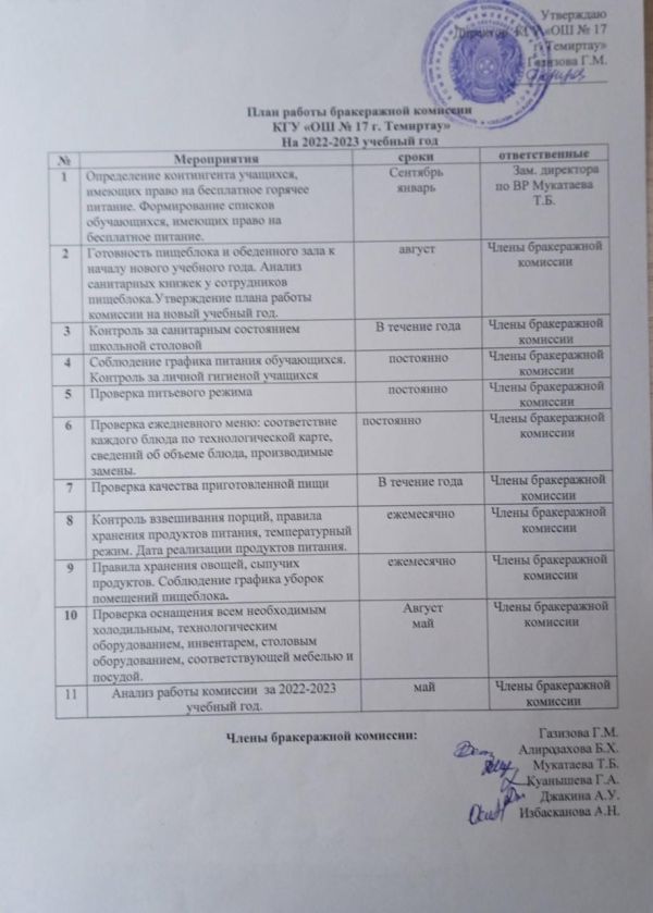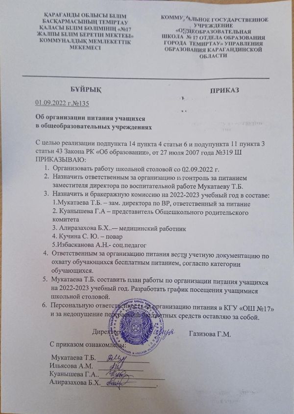 Организация питание в КГУ "ОШ №17"  на 2022-2023 учебный год
