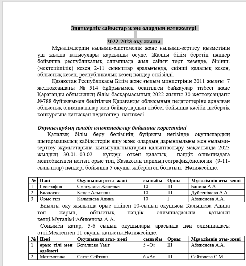 Зияткерлік сайыстар және олардың нәтижелері 2022-2023 оқу жылы