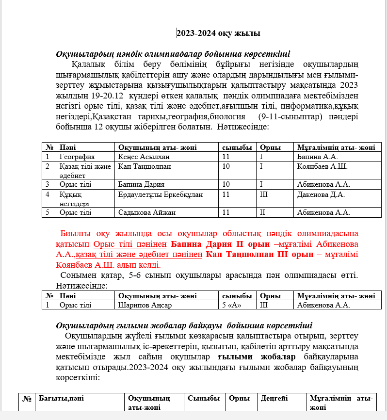 Оқушылардың пәндік олимпиадалар бойынша көрсеткіші