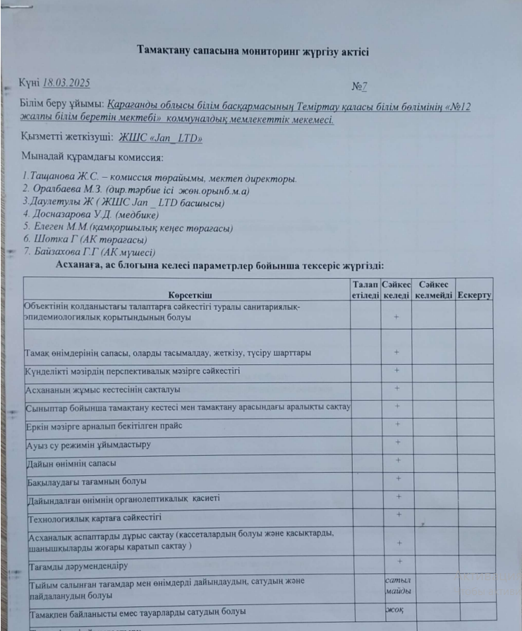 Тамақтану сапасына мониторинг жүргізу актісі
