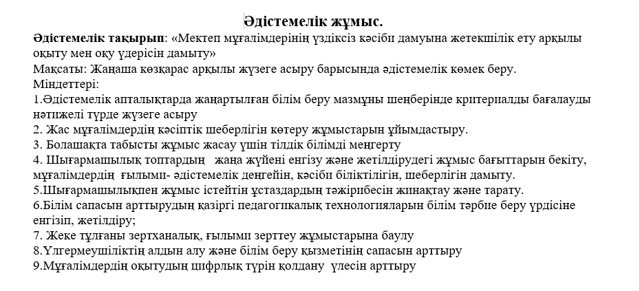 Әдістемелік тақырып: «Мектеп мұғалімдерінің үздіксіз кәсіби дамуына жетекшілік ету арқылы оқыту мен оқу үдерісін дамыту»