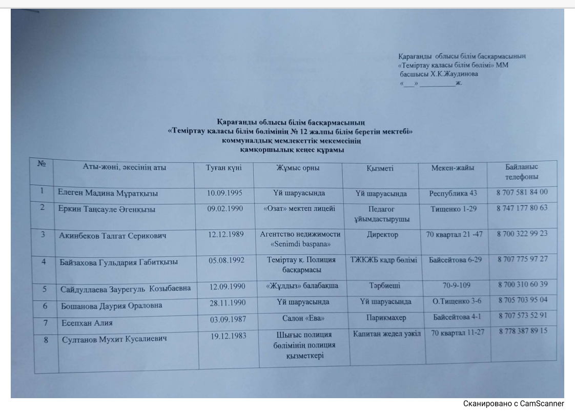 Қарағанды оьлысы білім басқармасының, Теміртау қаласы білім бөлімінің "№12 ЖББМ" КММ қамқоршылық кеңесінің құрамы