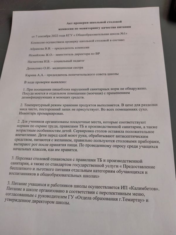 Акт проверки школьной столовой комиссии по мониторингу качества питания