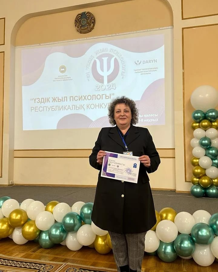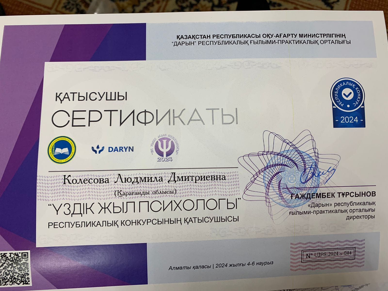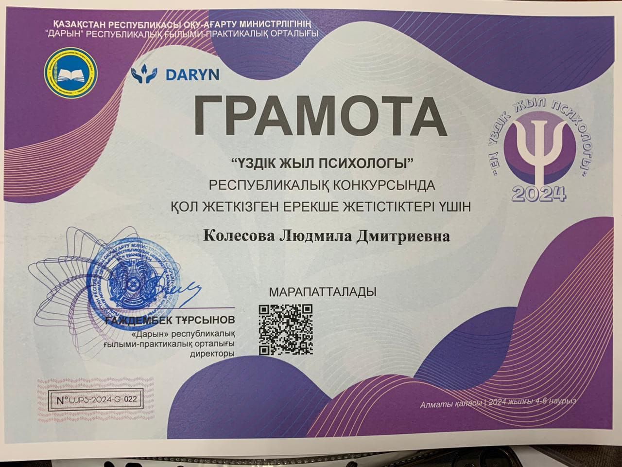 Колесова Людмила Дмитриевна, успешно защитила авторскую программу на республиканском конкурсе в г. Алматы и получила грамоту "Лучший психолог" года!!!