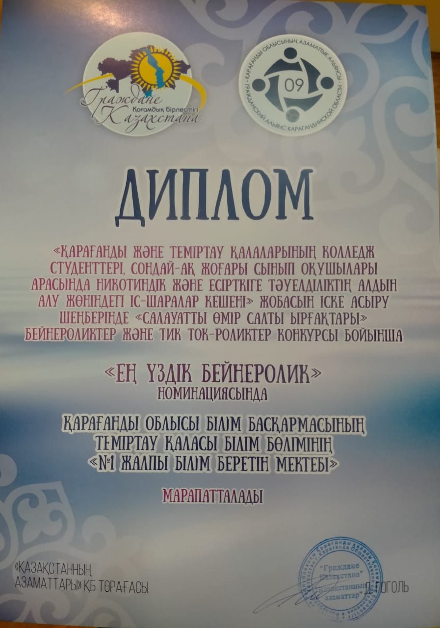 Писарева Ангелина ученица 11 "А" класса КГУ "ОШ 1" участвовала в конкурсе Тик-Ток роликов "Ритмы здорового образа жизни" в рамках реализации проекта "Комплекс меро…