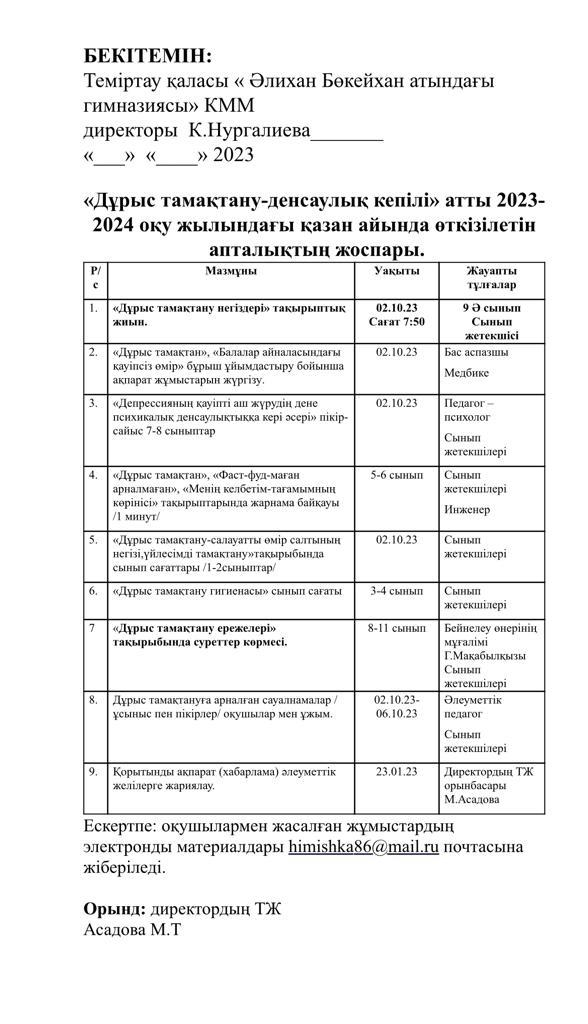 2023-2024 оқу жылындағы қазан айында "Дұрыс тамақтану" апталығының жоспары