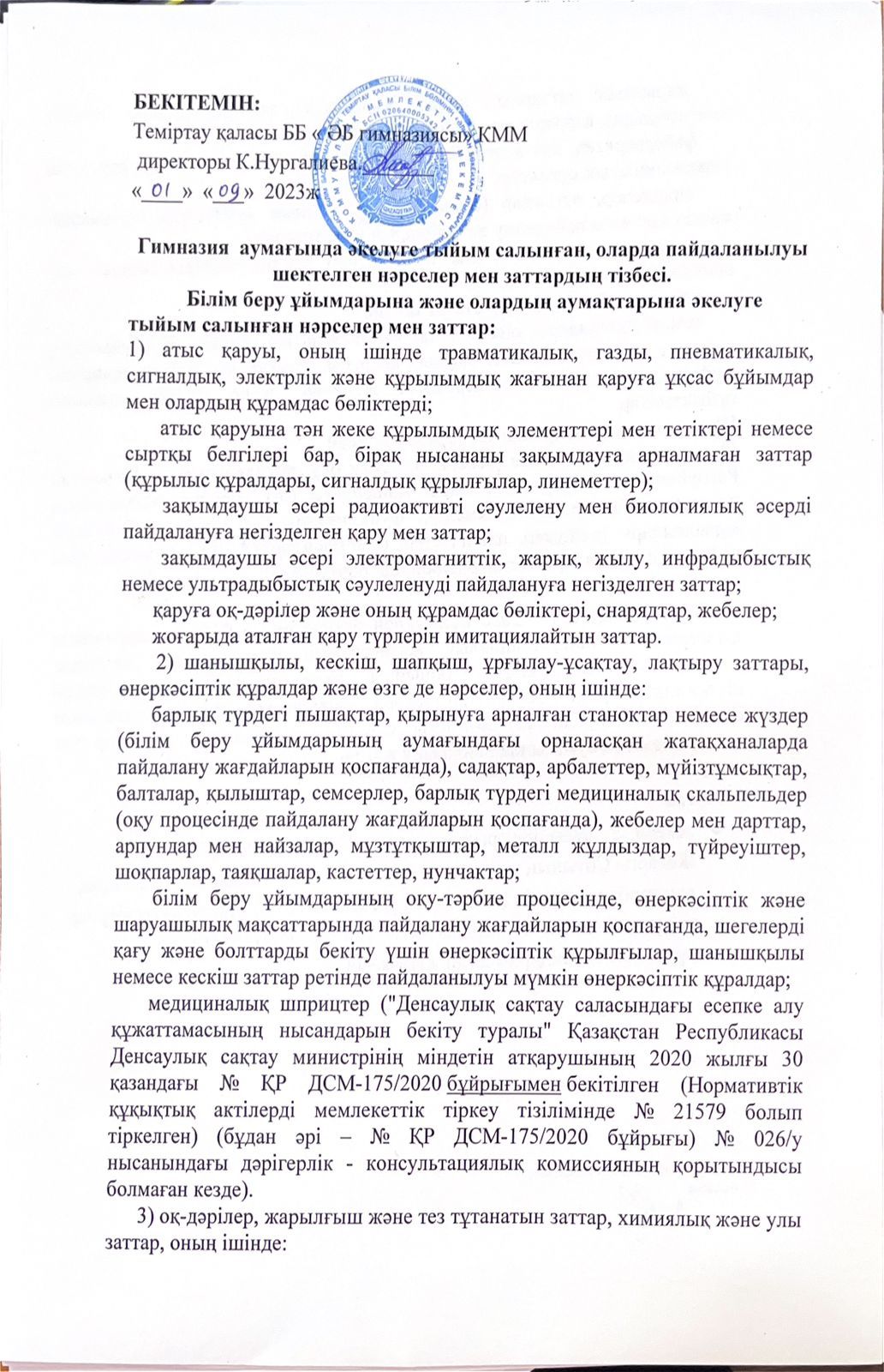 2023-2024 оқу жылында гимназияда терроризмге қарсы қорғалуды және қауіпсіздікті қамтамасыз ету бұйрығы