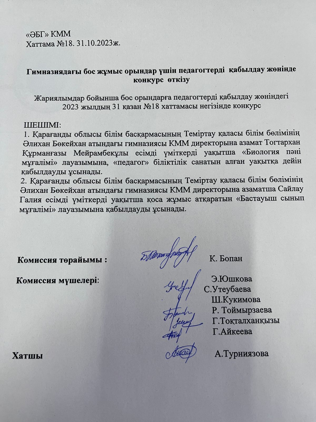 № 18 Хаттама. 31.10.2023 жылғы Конкурс нәтижесі.