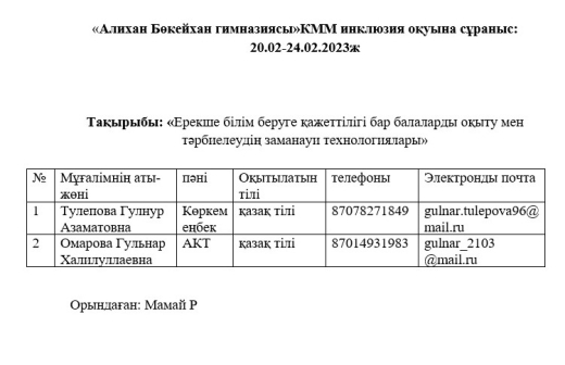 Алихан Бөкейхан гимназиясы»КММ инклюзия оқуына сұраныс: 20.02-24.02.2023ж
