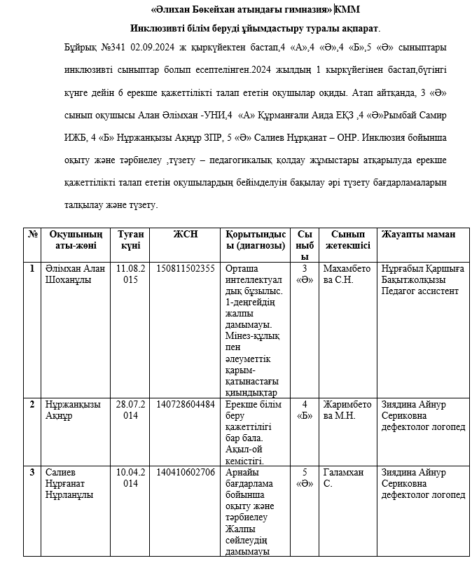 Бұйрық №341 02.09.2024 ж қыркүйектен бастап,4 «А»,4 «Ә»,4 «Б»,5 «Ә» сыныптары инклюзивті сыныптар болып есептелінген.2024 жылдың 1 кыркүйегінен бастап…