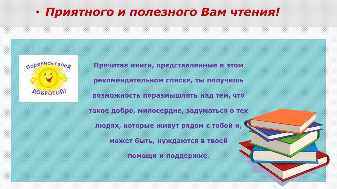 В рамках акции « ДосбоLike:предложи руку дружбы», предлагаем вашему вниманию рекомендательный список литературы «Добро рассыпанное на страницах книг». Прочитав книги, предста…