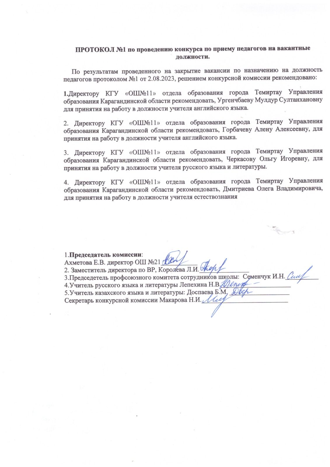 Протокол №1 по проведению конкурса по приеу педагогов на вакантные должности