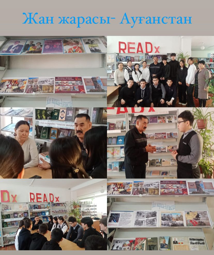 Кеңес әскерлерінің Ауғанстан жерінен шығарылғанына 35 жыл толуына орай мектеп кітапханасында ,,Жан жарасы- Ауғанстан" атты көрме ұйымдастырылып,10 сынып оқушылары және Ауған соғысының ард…