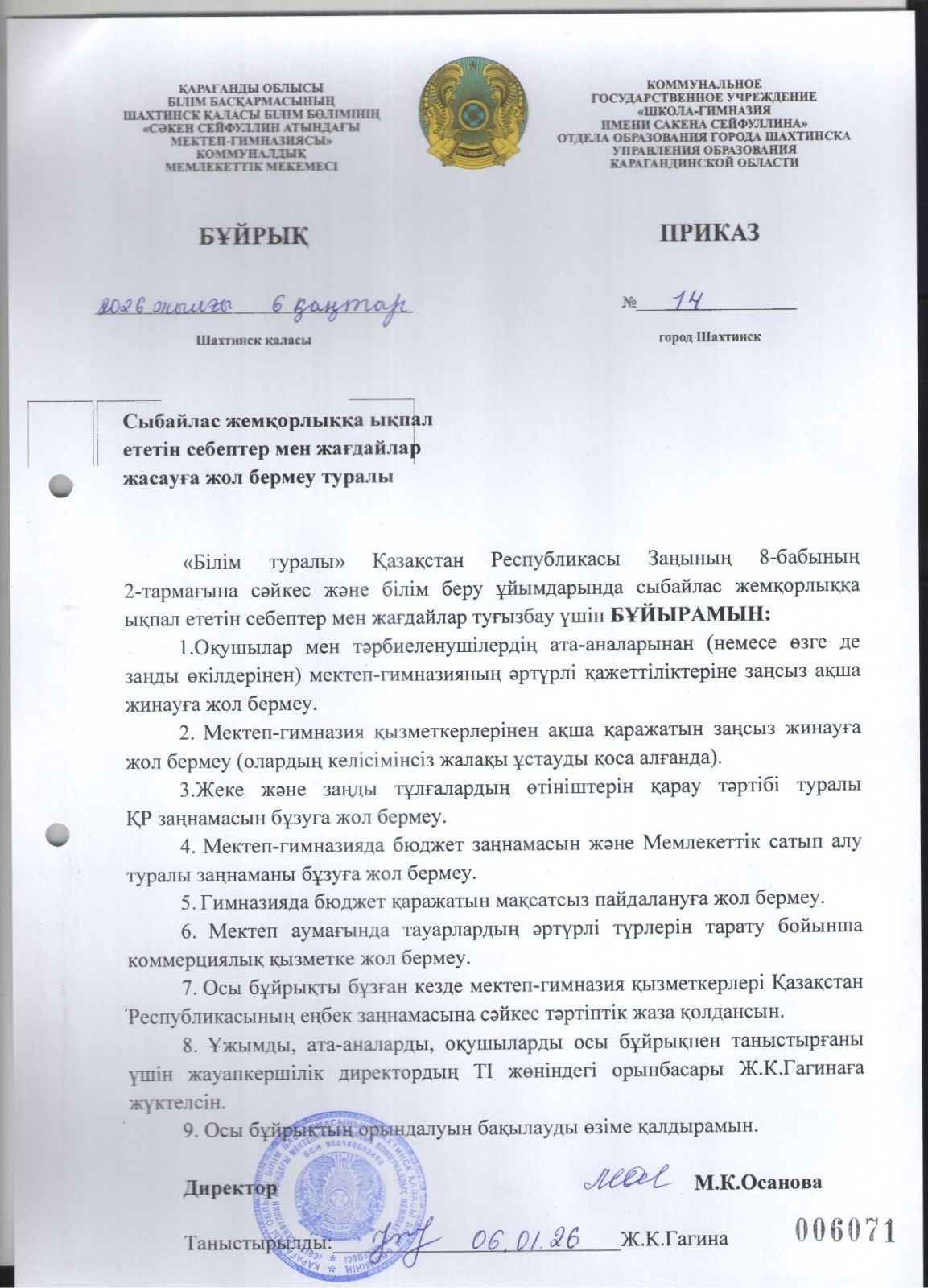 Приказ "О мерах по предупреждению коррупции" гос. яз