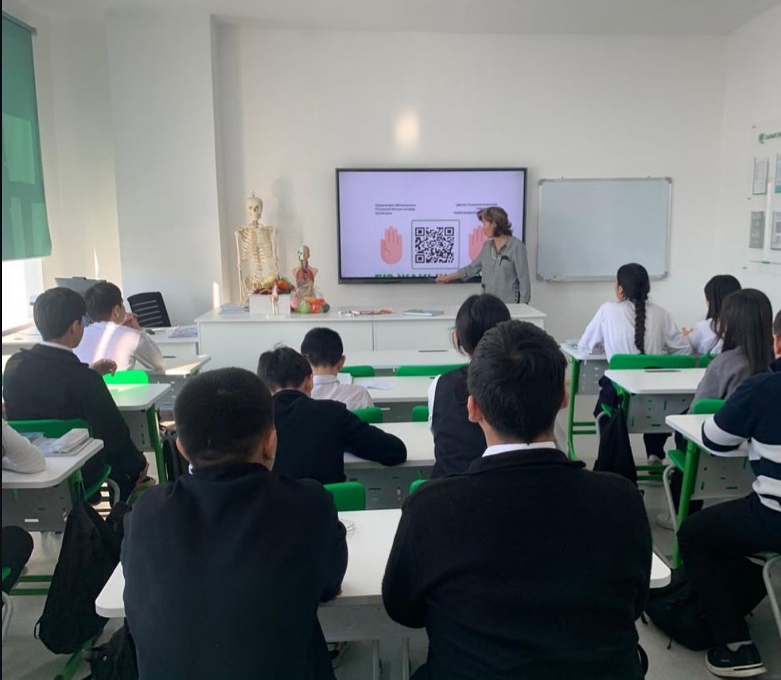 Мектебіміздің психологы А. Х. Баисова оқушыларға “111” байланыс орталығы QR коды және “Біз жаныңдамыз” буллингтен қорғану және алдын-алу бойынша QR кодтарме…