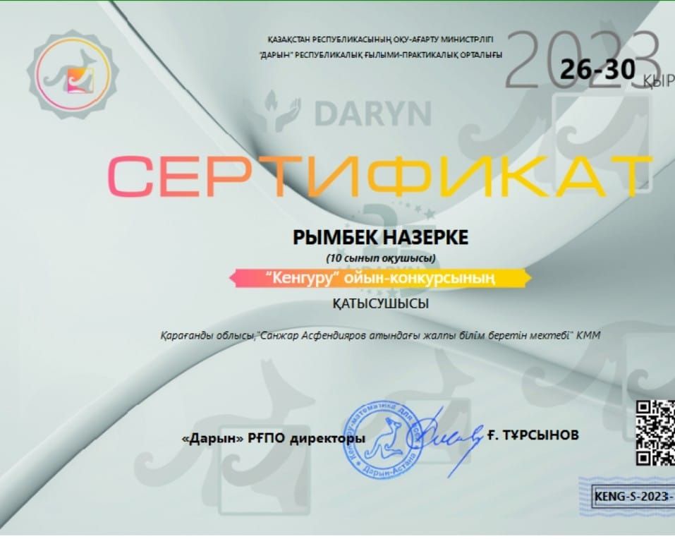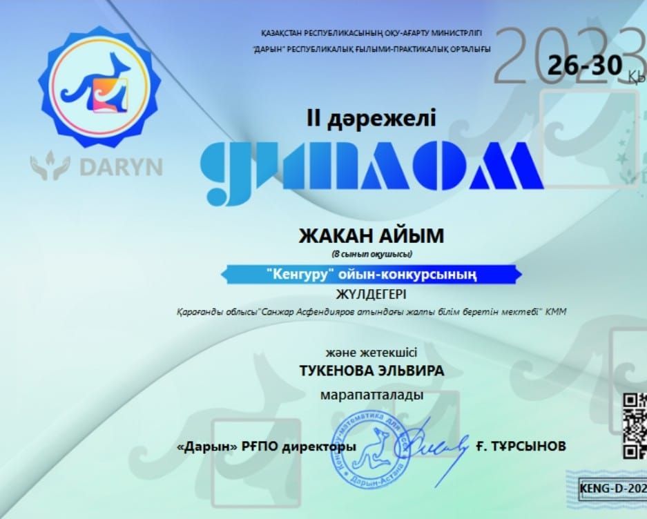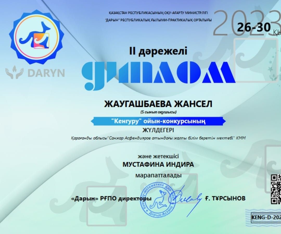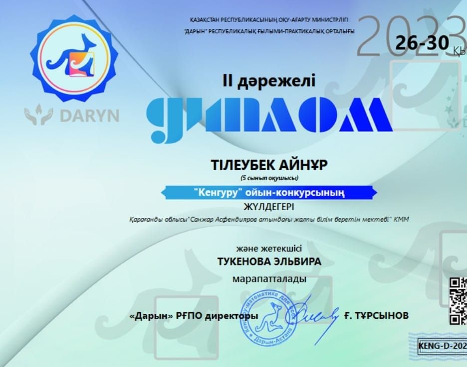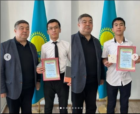 Қазақ тілі пәні бойынша: 5- сынып оқушысы Уринбасарова Айман 3- орын; 6- сынып оқушысы Жаугашбаева Жанс…