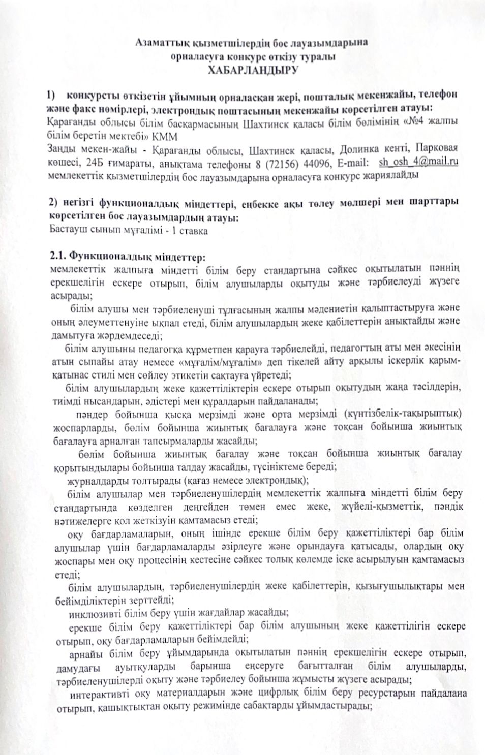 Азаматтық қызметшілердің бос лауазымдарына орналасуға конкурс өткізу туралы ХАБАРЛАНДЫРУ