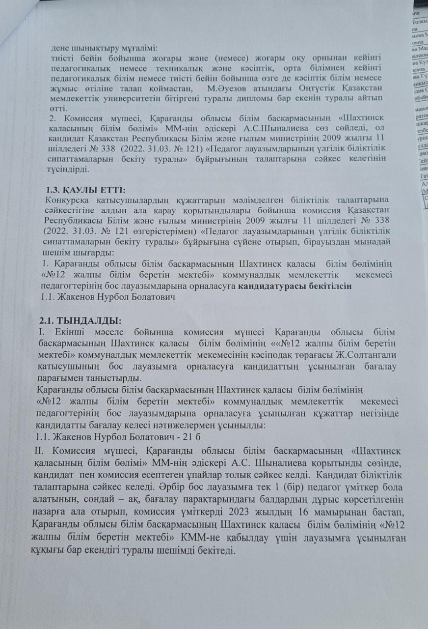 Жұмысқа қабылдау бойынша конкурстың қорытындысы
