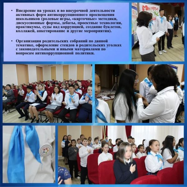27 октября, посвященных Дню Республики, в школе-лицее №14 прошел торжественный прием учащихся в члены добровольного школьного клуба антикоррупционной культуры «Адал Ұрпак».