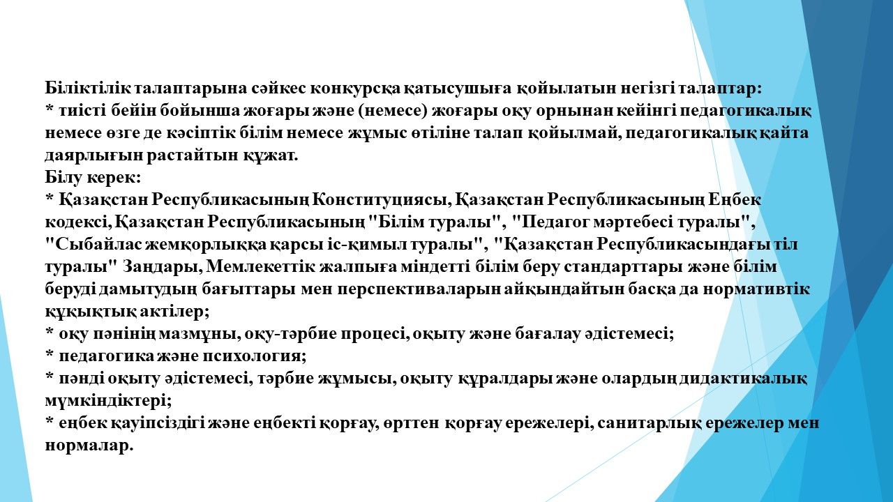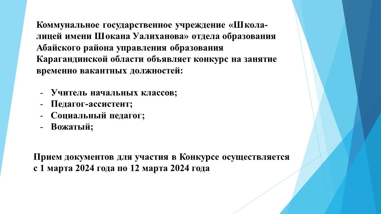 Қарағанды облысы білім басқармасының Абай ауданы білім бөлімінің «Шоқан Уәлиханов атындағы мектеп-лицейі» коммуналдық мемлекеттік мекемесі уақытша бос лауазымдарға орналасуға конкурс жар…