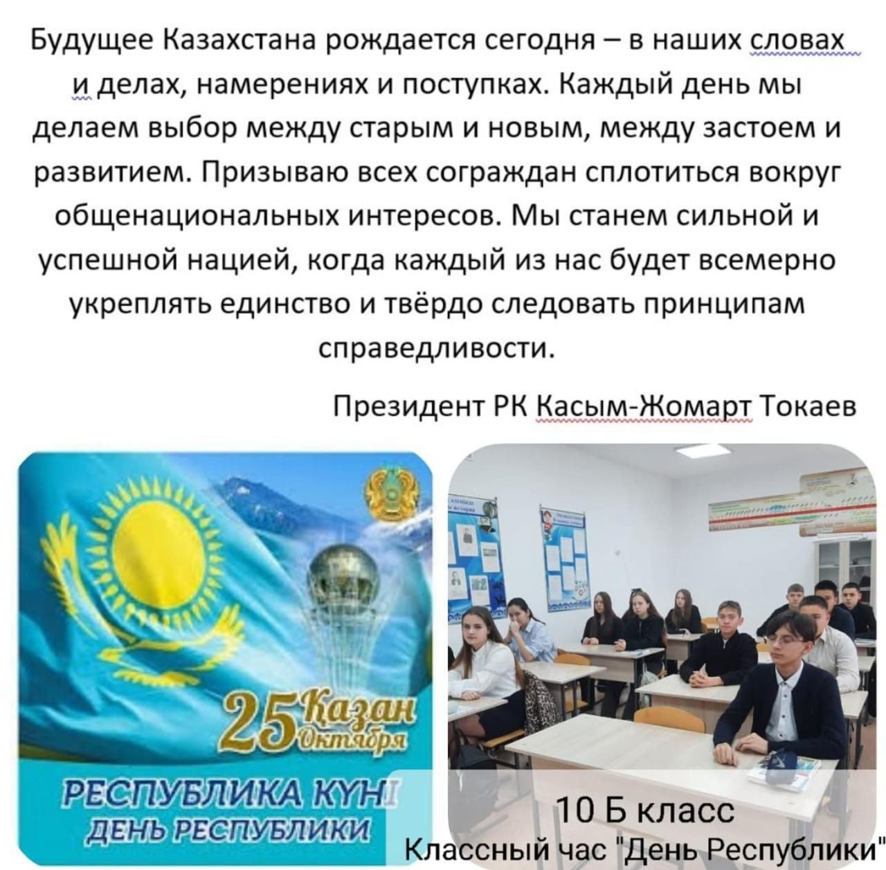 21 октября 2024 года в школе имени Касыма Аманжолова прошли классные часы на тему «Республикам – мақтанышым !» Құндылықтар : Жасампаздық және жаңашылдық «Қазақ елі менің&ra…