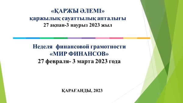 27 февраля 2023 года в КГУ «ОШ им.К.Аманжолова» стартовала Неделя финансовой грамотности «ҚАРЖЫ ӘЛЕМІ» - «МИР ФИНАНСОВ».