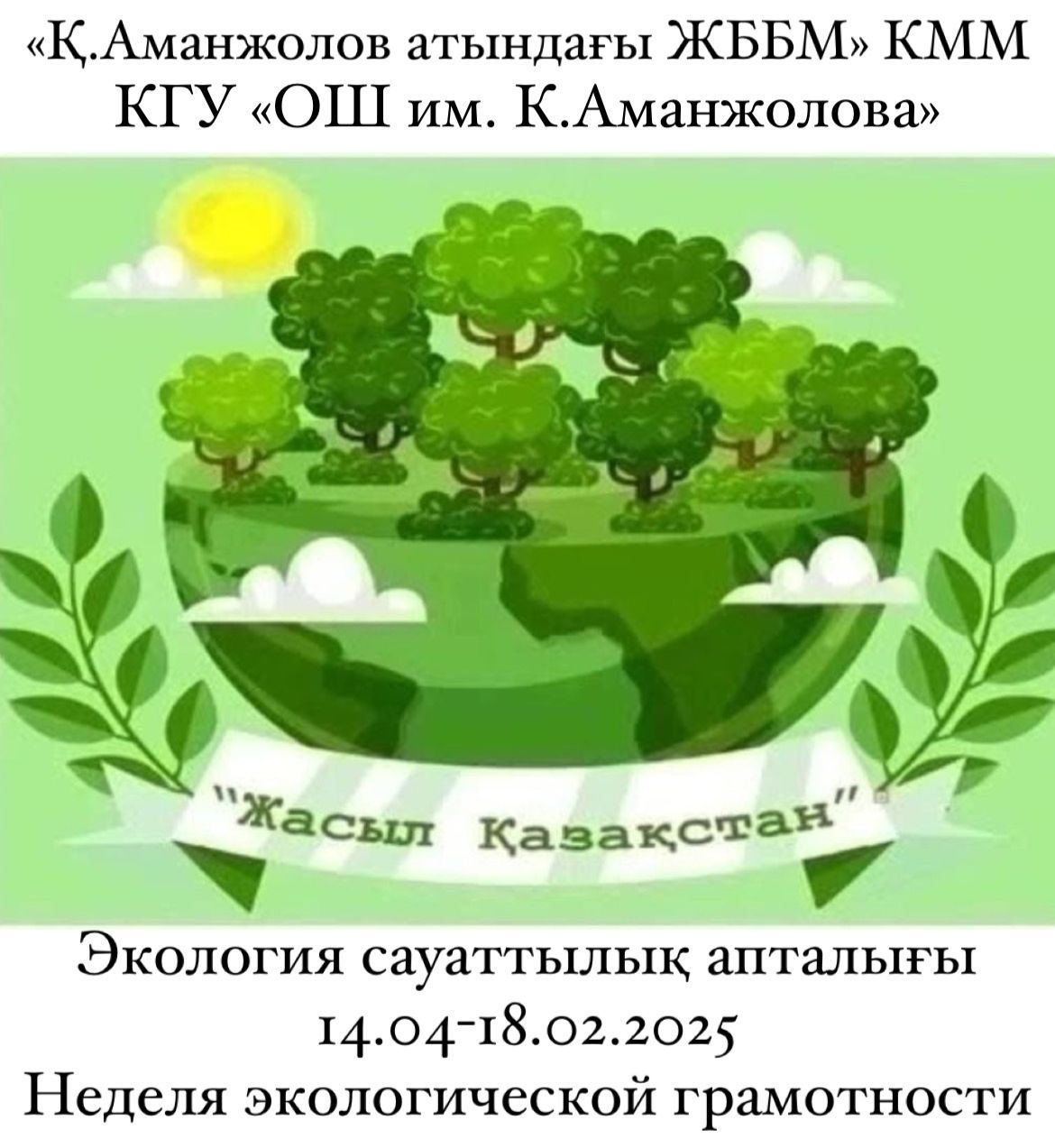 14 сәуір 2025 жылы «Қ. Аманжолова атындағы ЖББМ» КММ: «Жасыл Қазақстан» атты экологиялық сауаттылық апталығының ашылуы өтті. Аптаның мақсаты-экологиялық мәдениетті, табиғат…