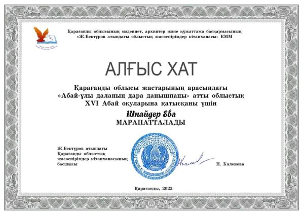 "Мичурин негізгі орта мектебі" КММ 9 сынып оқушысы Жайық Бектұров атындағы Қарағанды облыстық жасөспірімдер кітапханасында "Абай- ұлы даланың данышпаны" атты облыстық XVI Абай оқ…