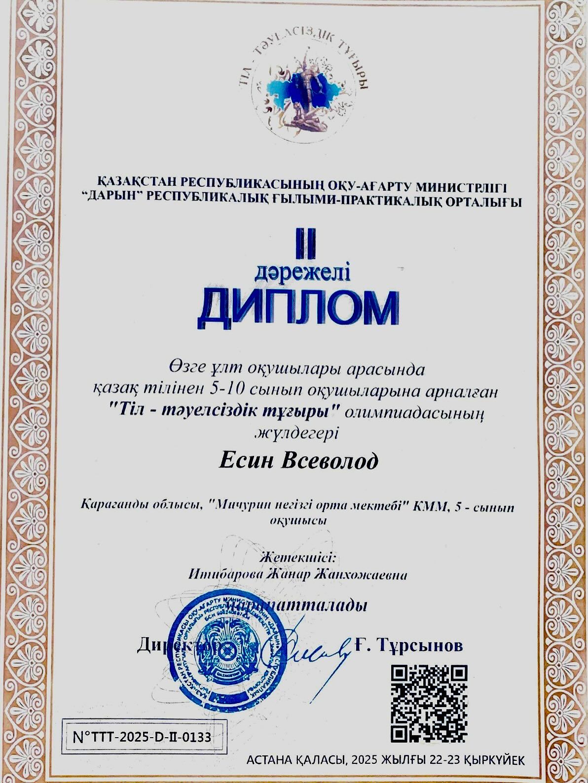 Победители олимпиады по казахскому языку среди учащихся 5-10 классов «Тіл - тәуелсіздік тұғыры» Тонких Илья , ученик 6 класса, и Есин Всеволод, ученик 5 класса.