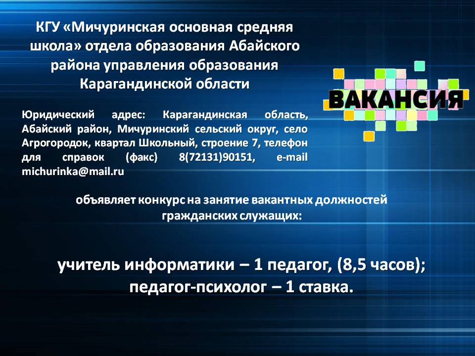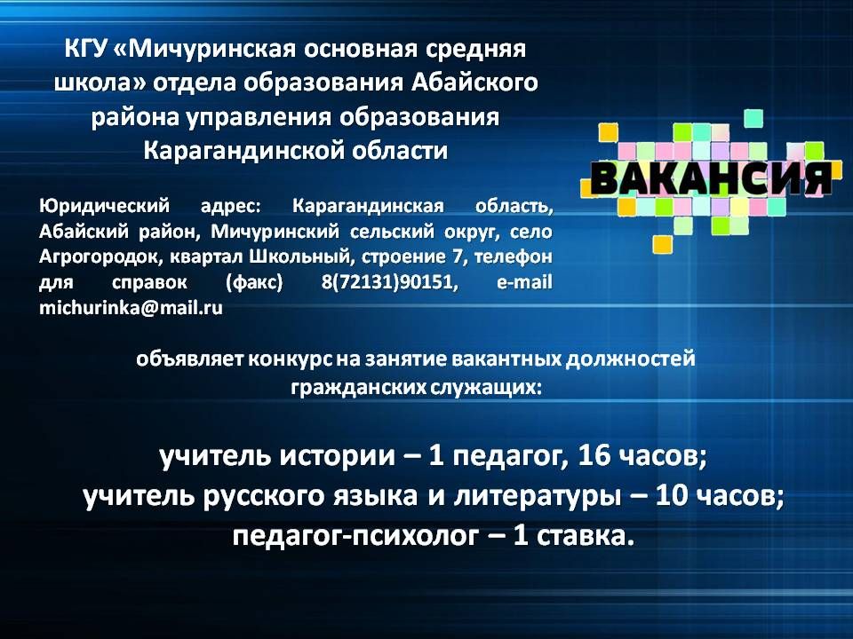 Бос лауазымдарға орналасуға конкурс жарияланады: тарих пәнінің мұғалімі-16 сағат Орыс тілі мен әдебиеті пәнінің мұғалімі - 10 сағат Педагог - психолог-1 ставка