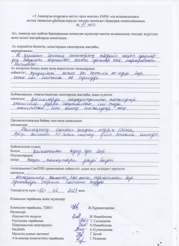"Т.Ақышұлы атындағы негізгі орта мектеп" КММ -де мектеп асханасында 1-4 сынып аралығында 22 оқушы, және 5-9 сынып арасында жекеленген…