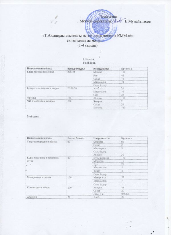 1-4 сыныптардың екі жетілік ас мәзірі